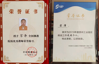 /全國佛教院校優(yōu)秀教師/蘇州工業(yè)園區(qū)統(tǒng)戰(zhàn)工作先進個人2020年12月2日,中國佛教協(xié)會第十次代表大會在浙江寧波閉幕,在“第二屆全國佛教院校優(yōu)秀教師榮譽稱號授予儀式”上,江蘇佛學院寒山學院宗澤法師榮獲“全國佛教院校優(yōu)秀教師”稱號。