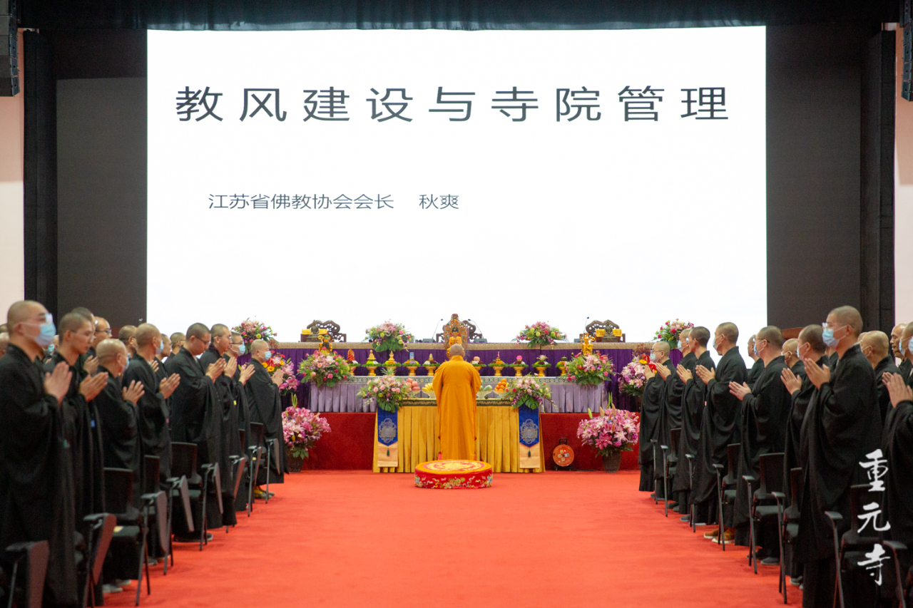 中國佛教協(xié)會副秘書長,江蘇省佛教協(xié)會會長,蘇州寒山寺、重元寺方丈,江蘇佛學院寒山學院、清涼學院院長秋爽大和尚為新戒作戒期總結。