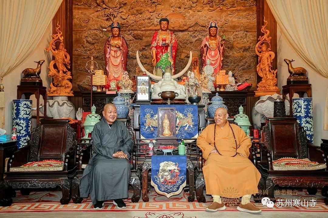 2023年5月23日,江蘇省民宗委副主任繆文軍,江蘇省佛教協(xié)會會長秋爽大和尚等一行到訪普陀山考察交流。中國佛教協(xié)會副會長、普陀山佛教協(xié)會會長、中國佛學院普陀山學院院長、觀音法界管理中心主任、普濟禪寺方丈道慈大和尚在普濟禪寺方丈殿熱情接待了考察團一行。