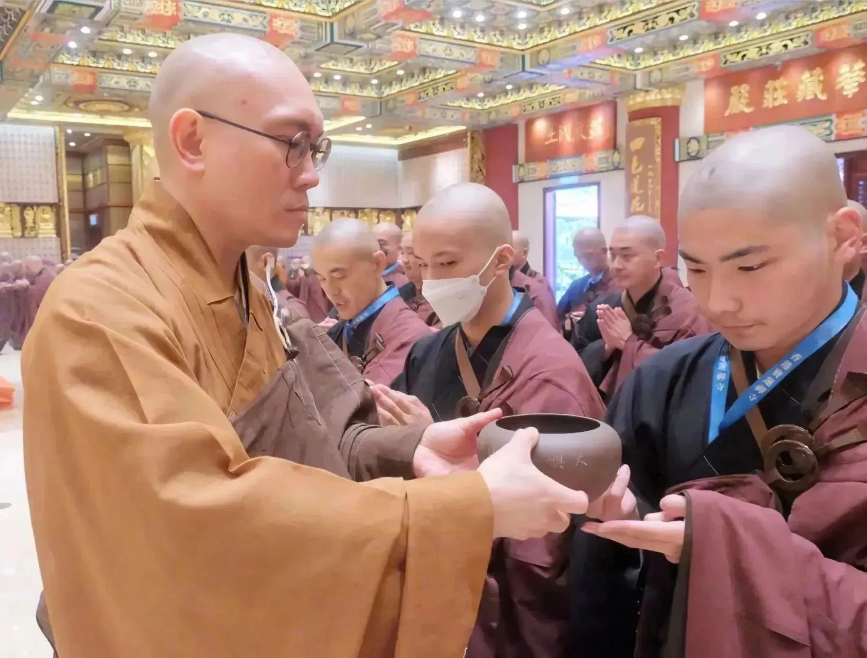 三師依次為新戒弟子凈水灌頂、剃發(fā)、授衣、授具、授缽、授濾水囊、授錫杖,并依照佛教傳統(tǒng)儀軌,如理如法地為眾戒子“正授沙彌戒”,成就了新戒沙彌身份。