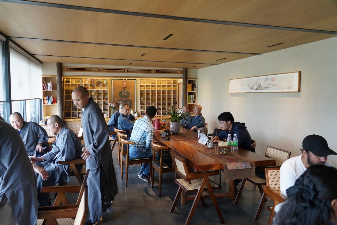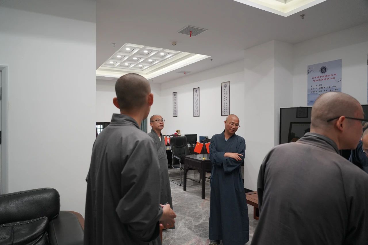 江蘇佛學(xué)院寒山學(xué)院副院長(zhǎng)兼教務(wù)長(zhǎng)宗澤法師、副教務(wù)長(zhǎng)耀相法師、教務(wù)主任如凈法師接待參訪團(tuán),帶領(lǐng)參觀重元寺、寒山學(xué)院教學(xué)樓,并進(jìn)行座談交流。