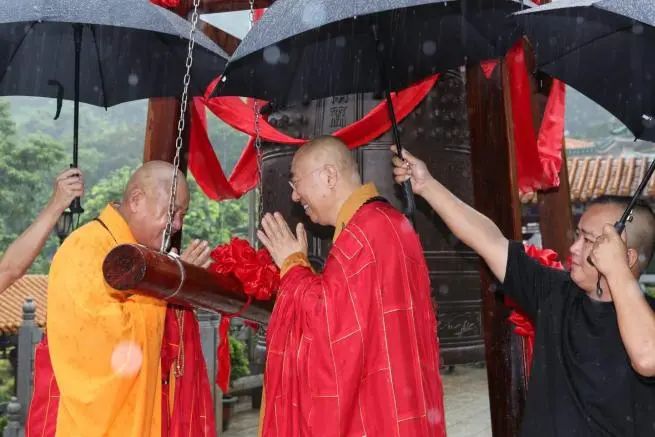 緊接著是叩鐘儀式,眾主禮嘉賓移步到五觀堂外就位,并分四組 、四次進行叩鐘: