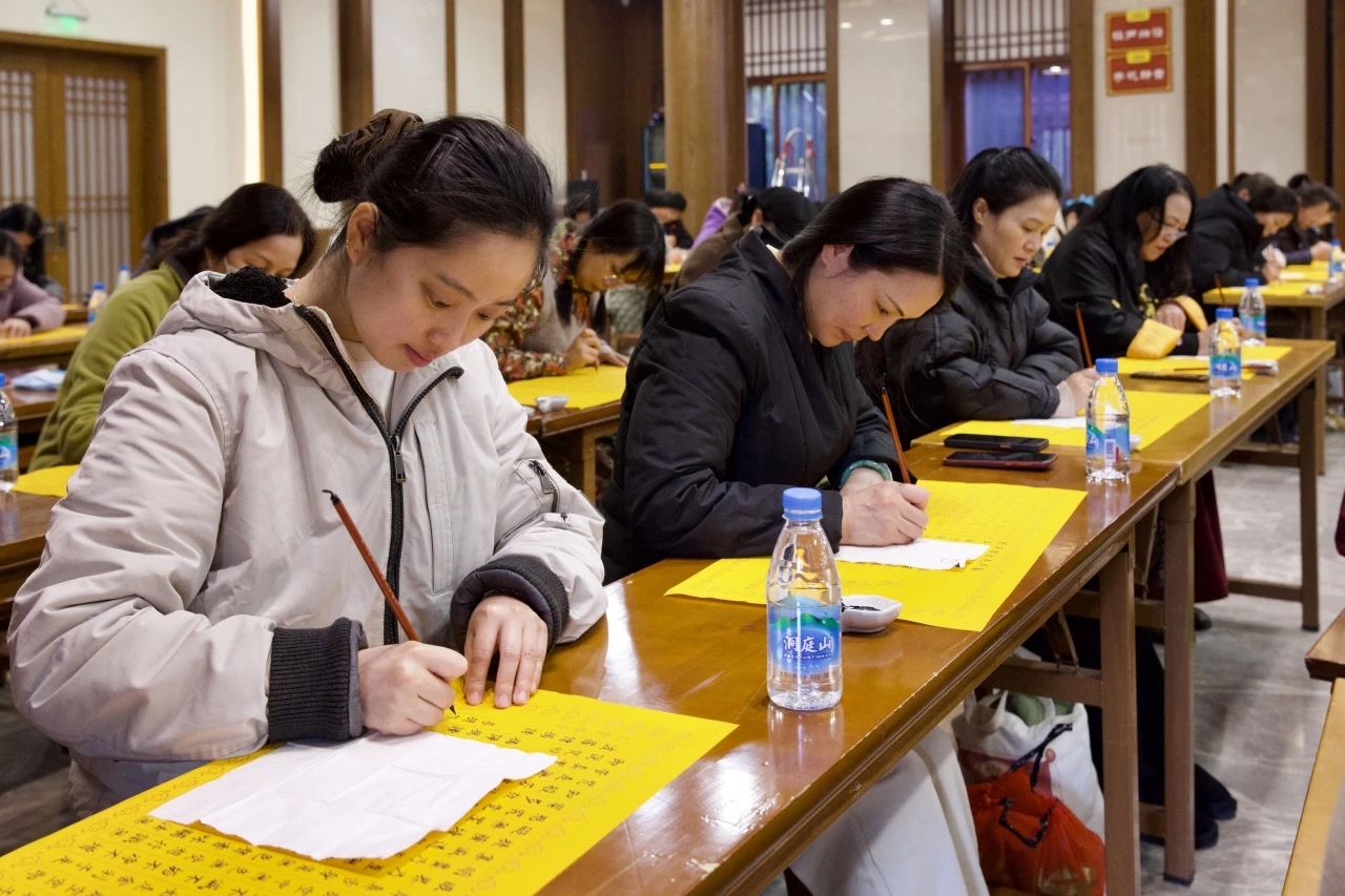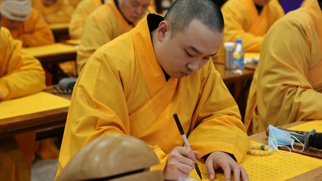 隨著大和尚拈香主法,梵音縈繞,眾人合掌恭誦“無上甚深微妙法,百千萬劫難遭遇。我今見聞得受持,愿解如來真實義。”在這一刻,浮躁與喧囂漸去,心歸于靜,每一位參與者皆以筆為法器,墨為法水,于一筆一劃間,書寫信愿,熏修慧命。