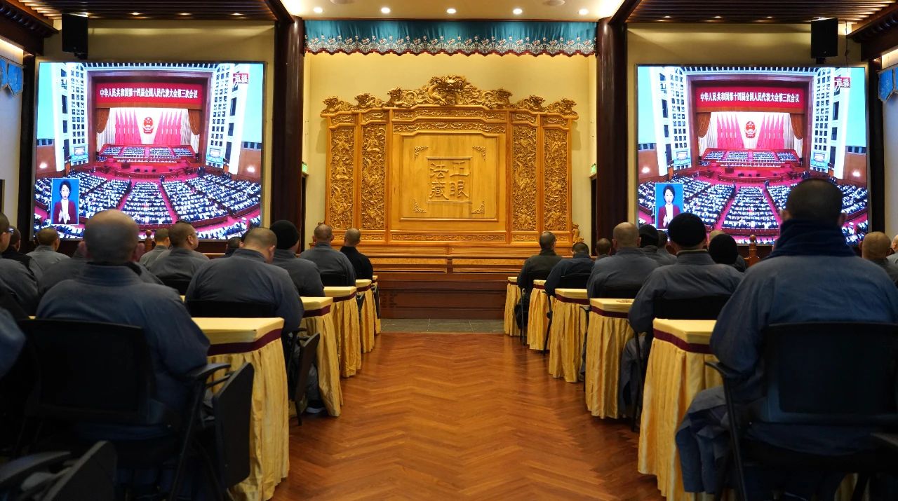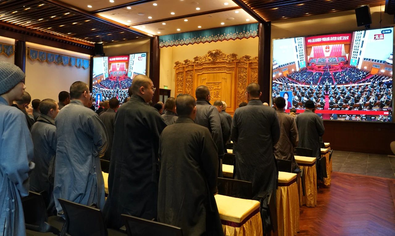 直播伊始,全體法師、學(xué)僧起立,跟大會直播一起高唱國歌。近三千名全國人大與會代表聽取政府工作報(bào)告。在觀看直播的過程中,大家精神飽滿、情緒高漲,不時報(bào)以熱烈掌聲,為祖國取得輝煌成就感到驕傲和自豪,對國家的全面發(fā)展充滿信心。