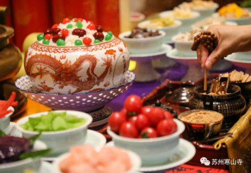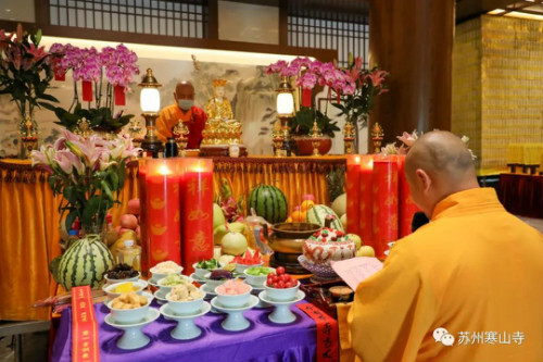 農(nóng)歷七月十五(8月22日)佛歡喜日,寒山寺舉行盂蘭盆法會(huì)。本寺方丈秋爽大和尚主法,恭誦《佛說盂蘭盆經(jīng)》,上盂蘭盆供。